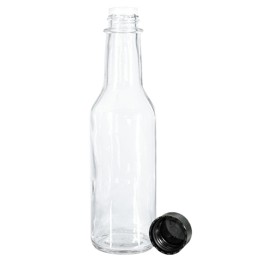 5 oz. Clear Glass Hot Sauce Bottle with Black Unlined Cap and Orifice Reducer (24/414) (V24) (V1)