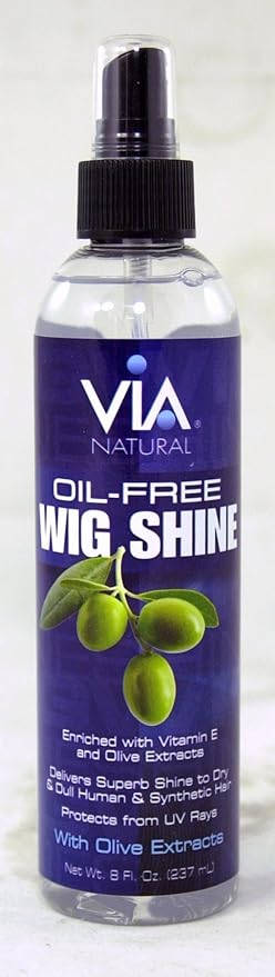 Enriched with Vitamin E and Olive Extracts: Delivers Superb Shine to Dry and Dull Human and Synthetic hair. Protects from UV Rays. Via Natural Oil Free WIG SHINE contains a unique blend of ingredients designed to impart shine but without oil to wigs, weaves and extensions. This spray penetrates quickly and easily without leaving a greasy feel or a greasy look.