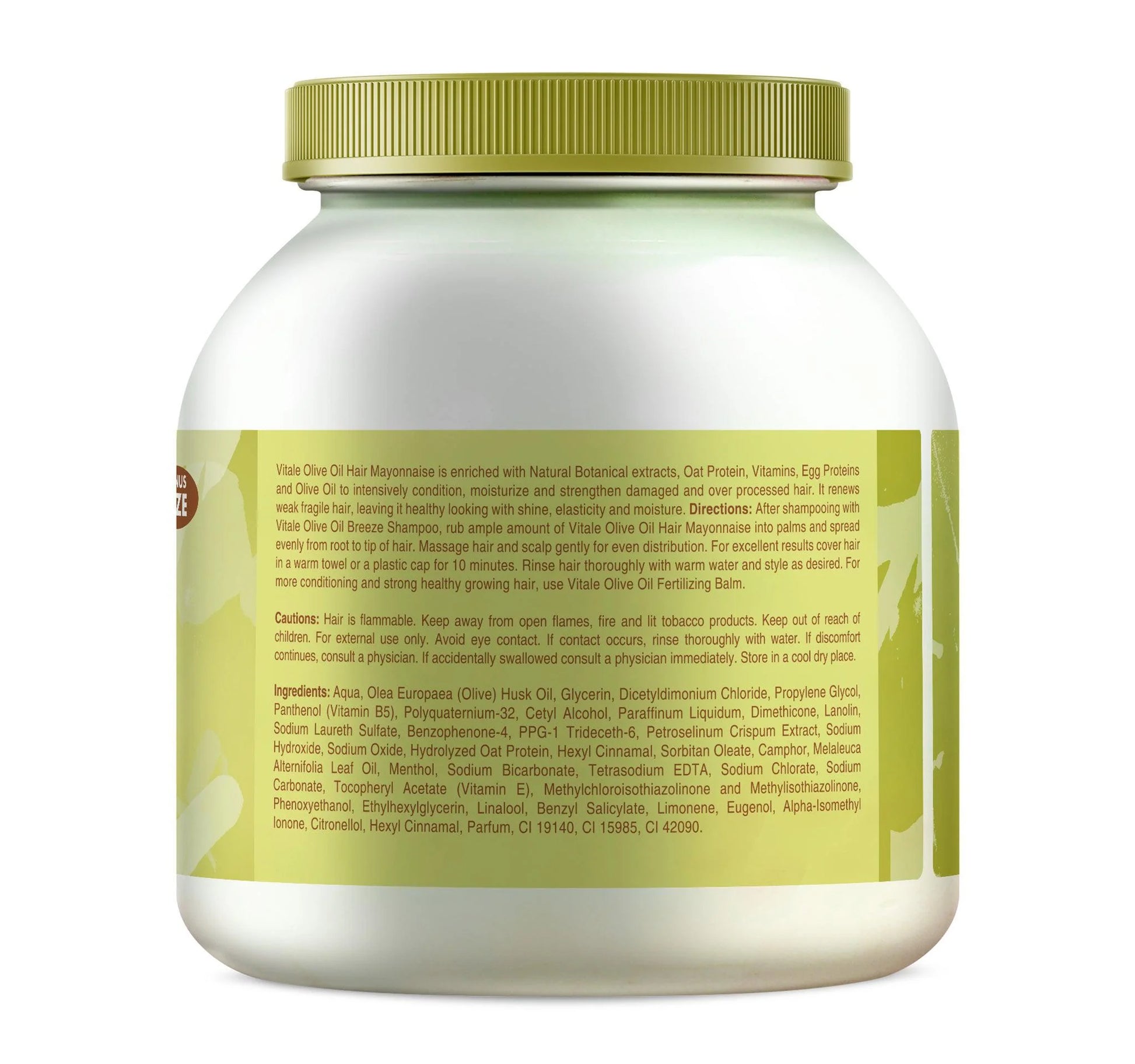 After shampooing with Vitale Olive Oil Breeze Shampoo, rub ample amount of Vitale Olive Oil Hair Mayonnaise into palms and spread evenly from root to tip of hair. Massage hair and scalp gently for even distribution. For excellent results cover hair in a warm towel or a plastic cap for 10 minutes. Rinse hair thoroughly with warm water and style as desired. For more conditioning and strong healthy growing hair, use Vitale Olive Oil Fertilizing Balm.